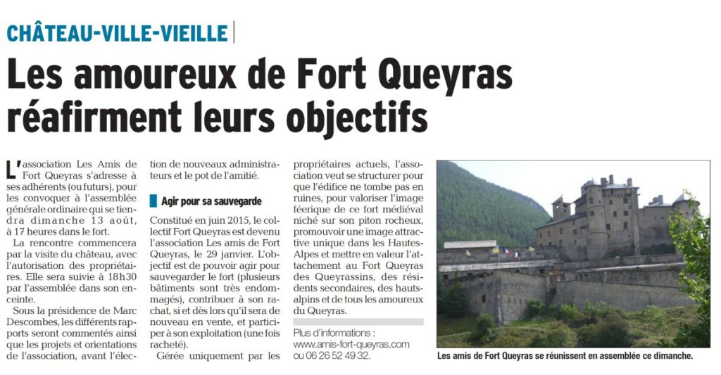 Voici l’article paru ce jour, mais avec une belle coquille : nous rappelons notre association est totalement indépendante, notamment des propriétaires actuels de Fort Queyras.