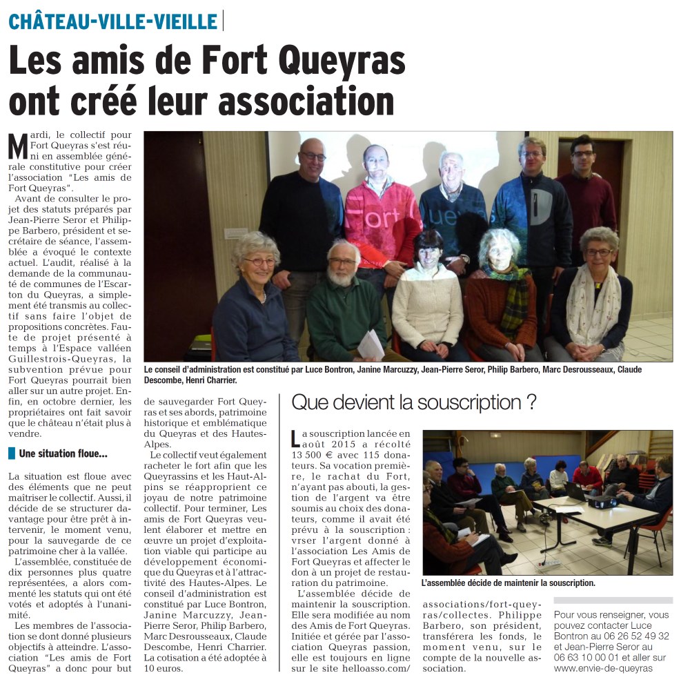 L’édition du 02 janvier 2017 du Dauphiné Libéré Hautes-Alpes rappèle la constition de l’association Les Amis de Fort Queyras